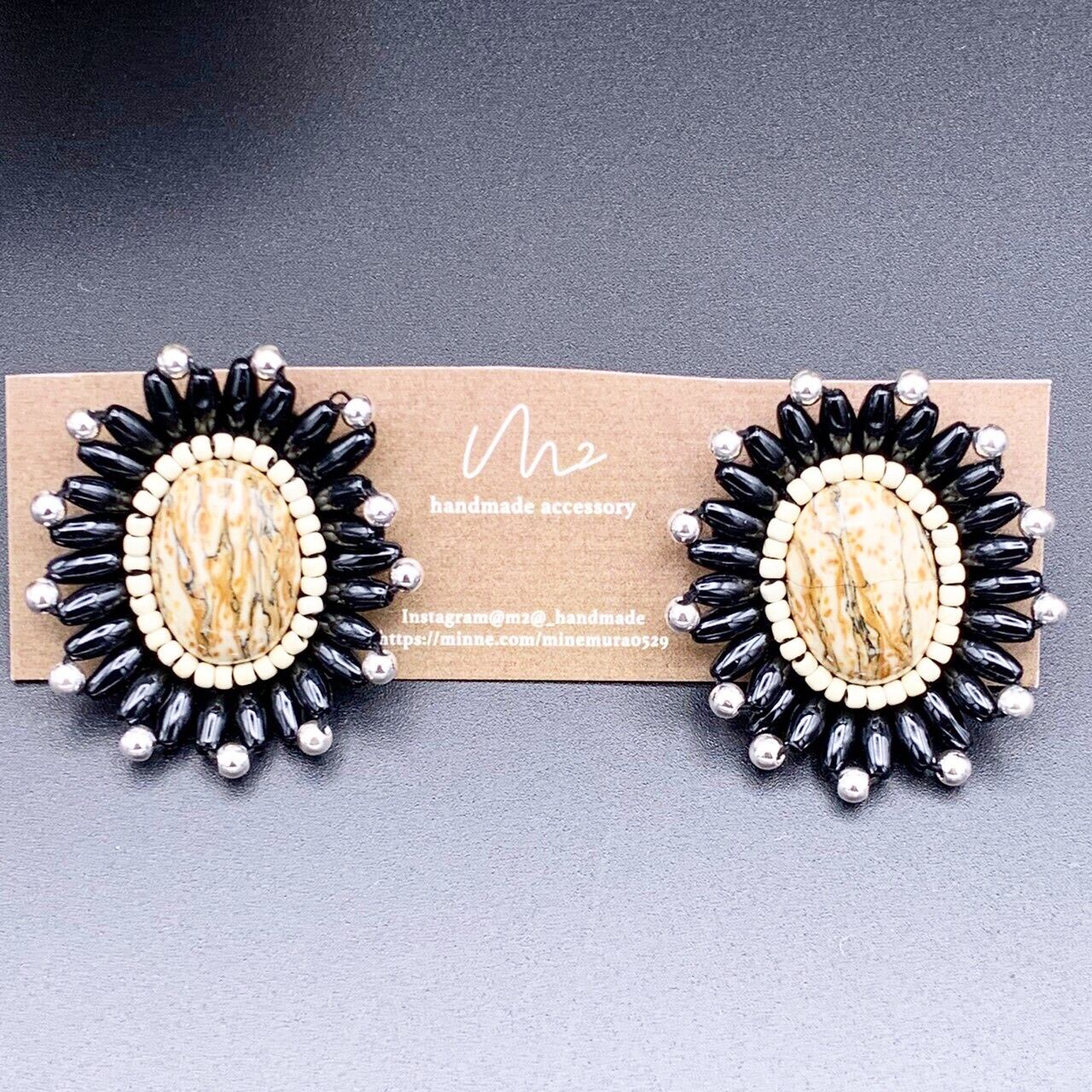 M2 ストーンを囲む様にブラックやシルバーボールビーズがお花の形のように刺繍されています。エスニック風で存在感◎デザインです⭐︎